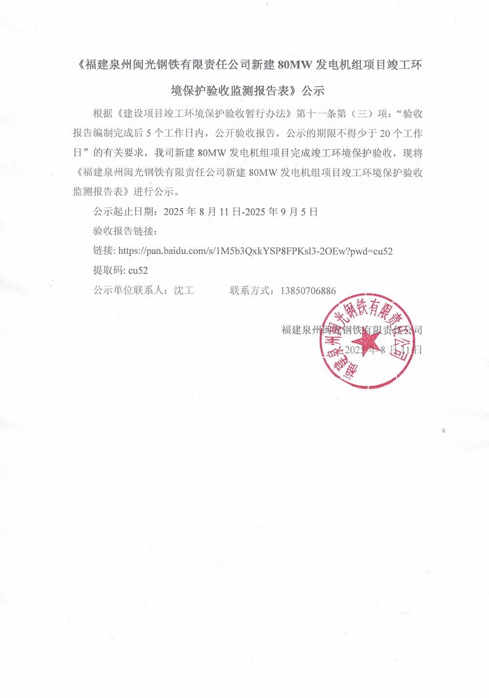《福建泉州閩光鋼鐵有限責(zé)任公司新建80MW發(fā)電機(jī)組項(xiàng)目竣工環(huán)境保護(hù)驗(yàn)收監(jiān)測(cè)報(bào)告表》公示