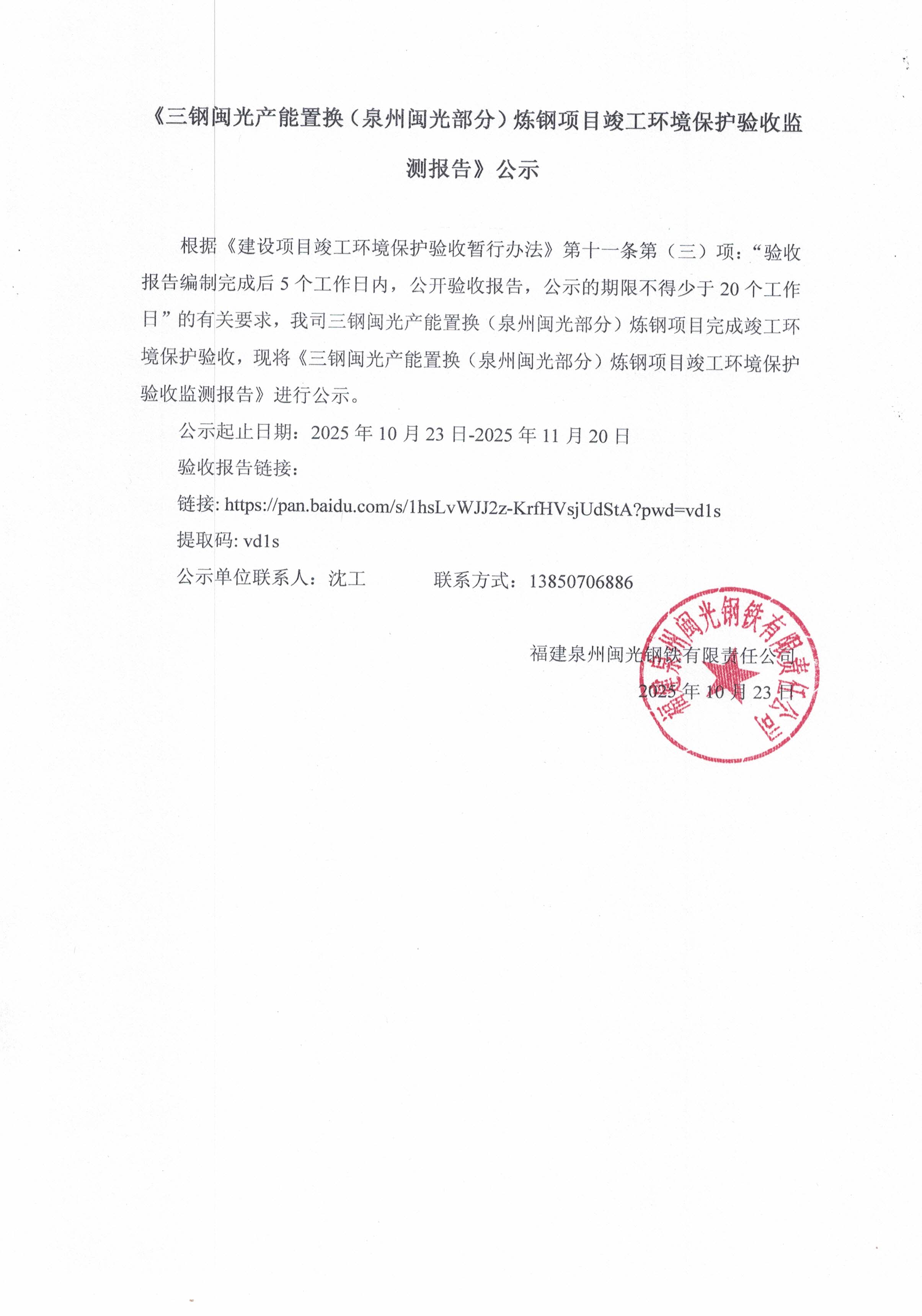 《三鋼閩光產(chǎn)能置換(泉州閩光部分)煉鋼項(xiàng)目竣工環(huán)境保護(hù)驗(yàn)收監(jiān)測(cè)報(bào)告》公示
