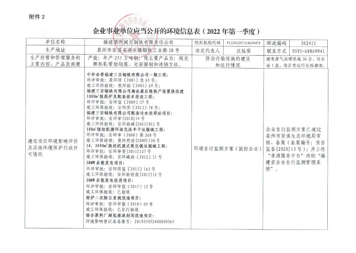 企業(yè)事業(yè)單位應(yīng)當(dāng)公開的環(huán)境信息表(2022年度第一季度)