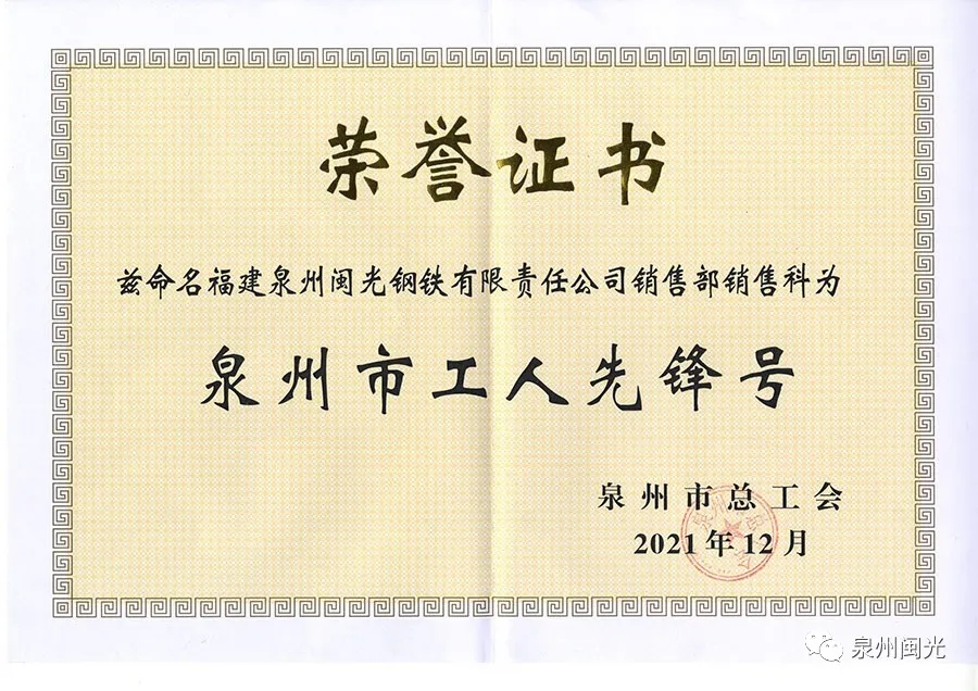 日前,泉州市總工會按照自下而上、逐級推薦、群眾認可、嚴格考核決定授予我司銷售部銷售科“泉州市工人先鋒號”榮譽稱號。1月6日上午,公司工會主席李盟城特此為該科室頒發(fā)榮譽獎牌和榮譽證書。